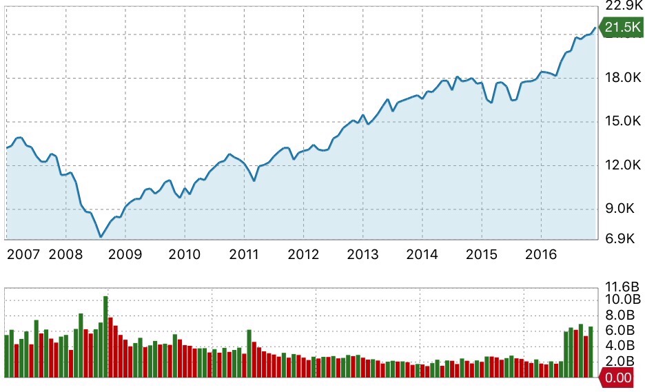 The stock market seemed to like the result. From the week of the Election it began going up, but what was it saying? With nearly eight months since, we can now not only note the 17% growth in the Dow during that period, but also note the change in the sheer volume of traded stock: